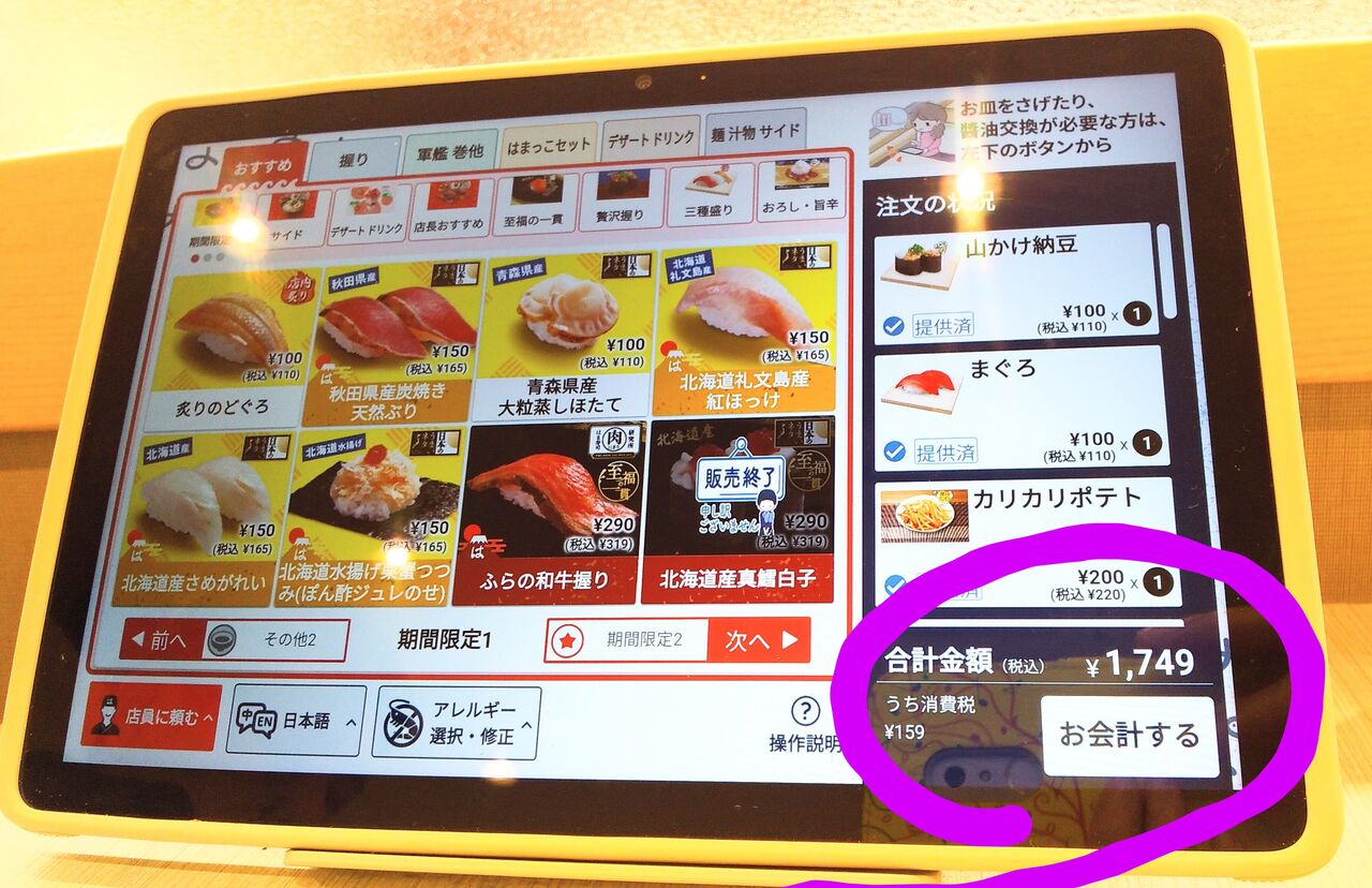 新しいはま寿司さんは完全オーダー式なのでタッチパネルに食べた合計金額が表示されて、ひと目でお会計額が分かるのもベリーグッドヾ(^▽^)ノ